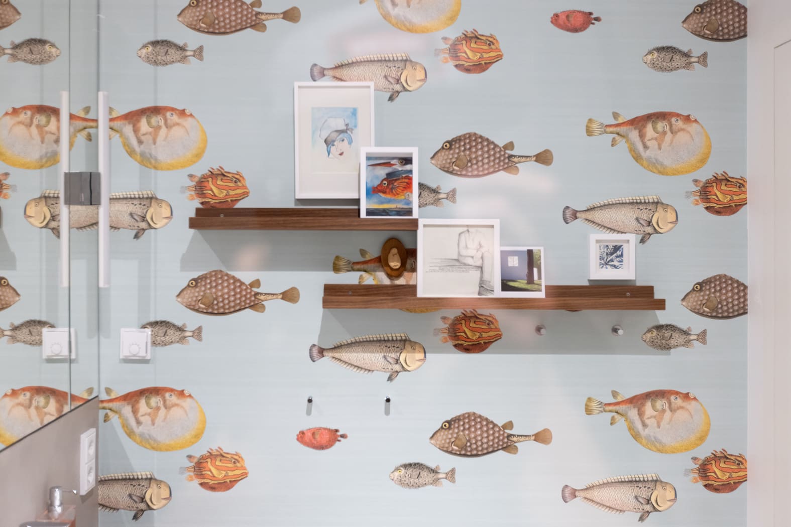 Das Damen-Bad besticht durch eine fischreiche Tapete, eine bodengleiche Dusche sowie bündig eingelassene Spiegel mit integrierter Beleuchtung.