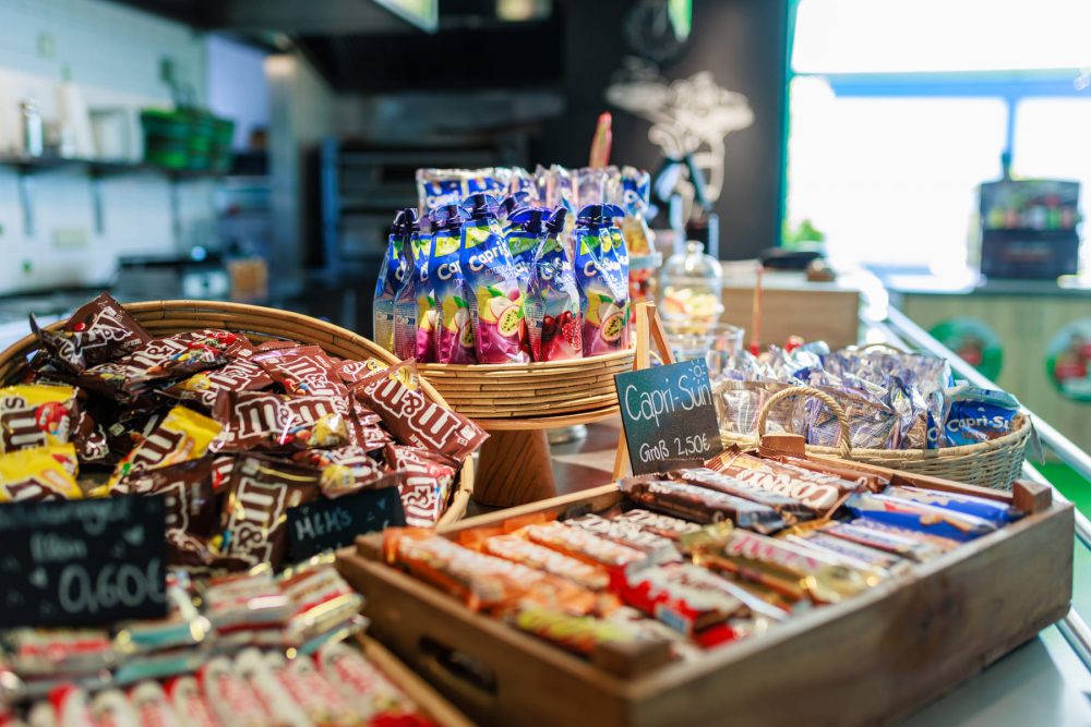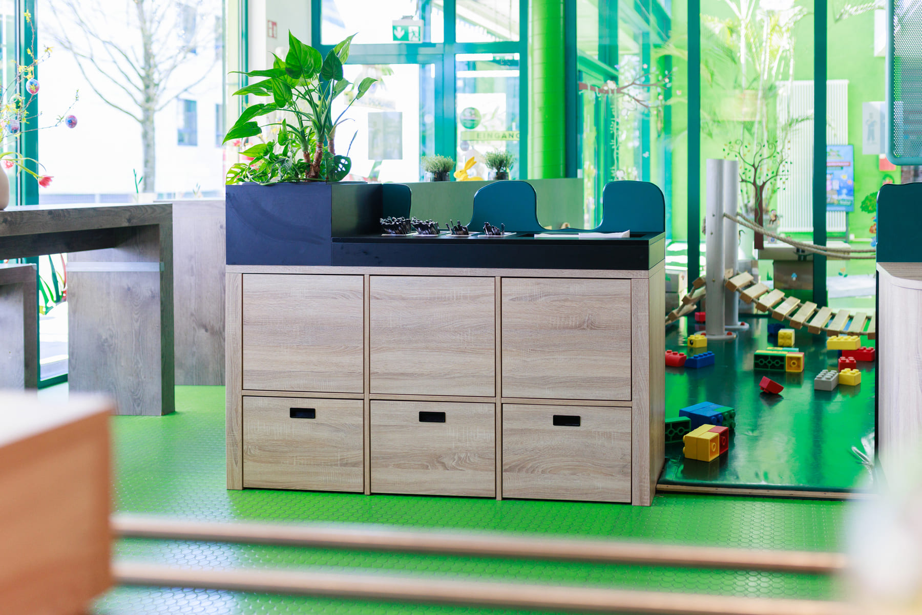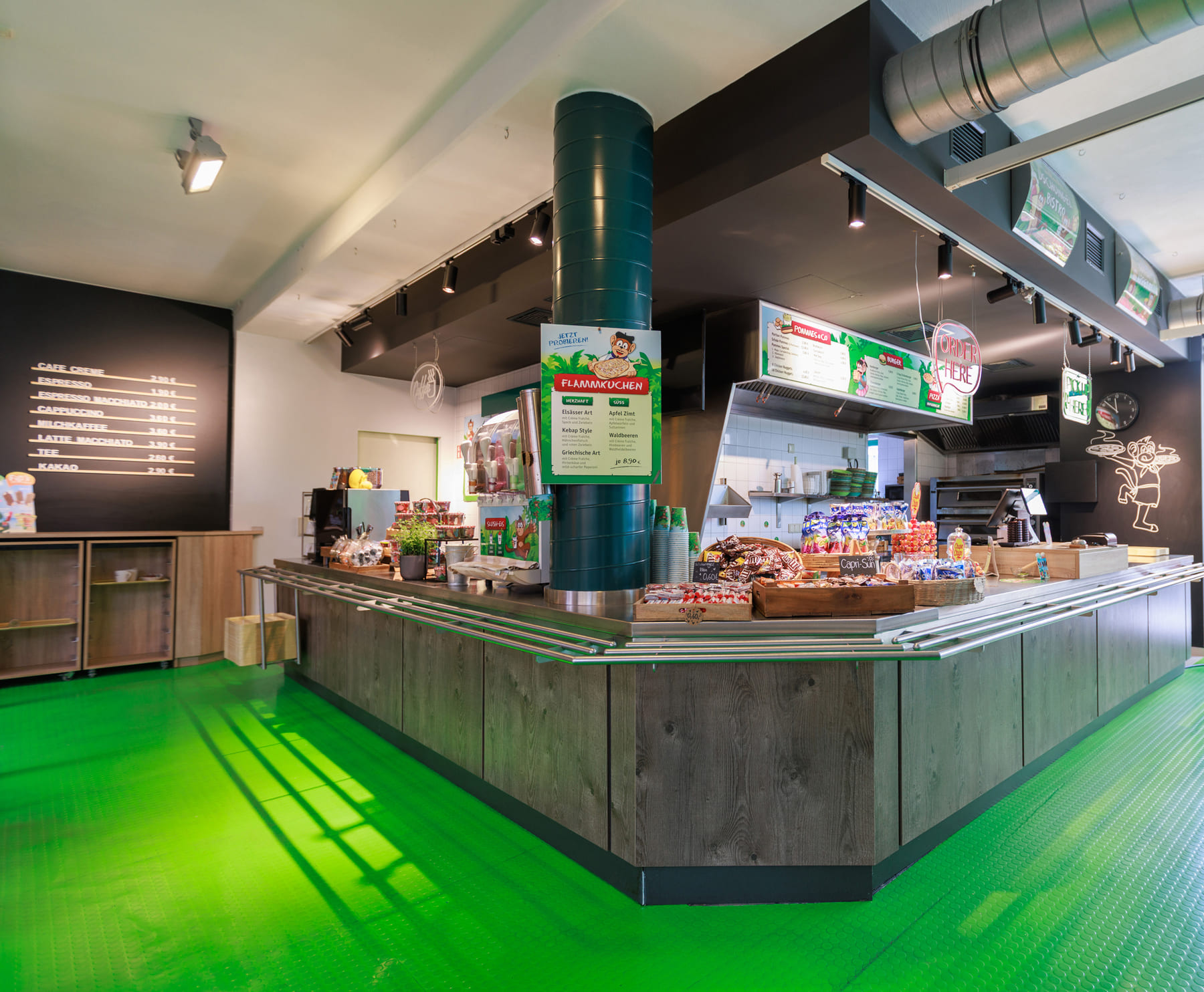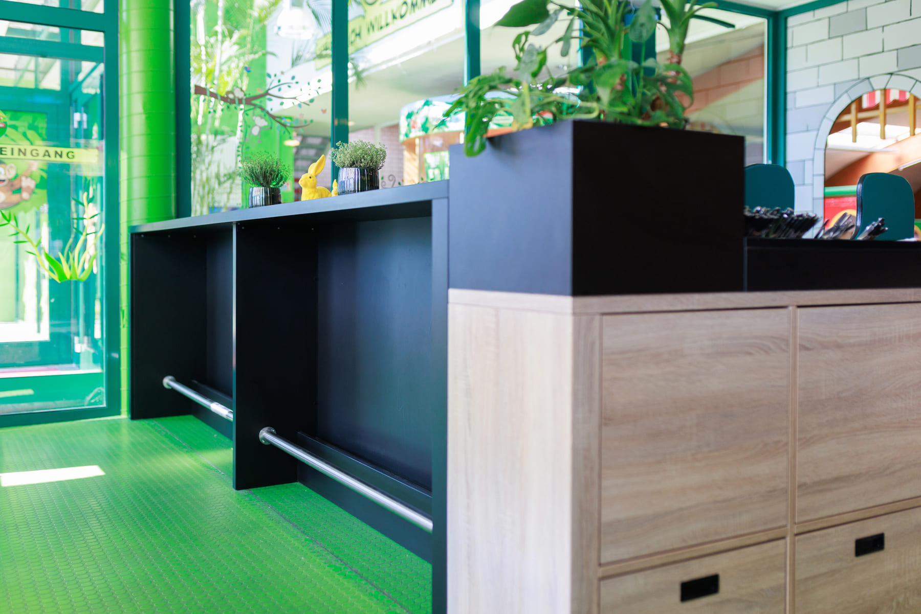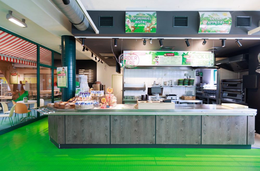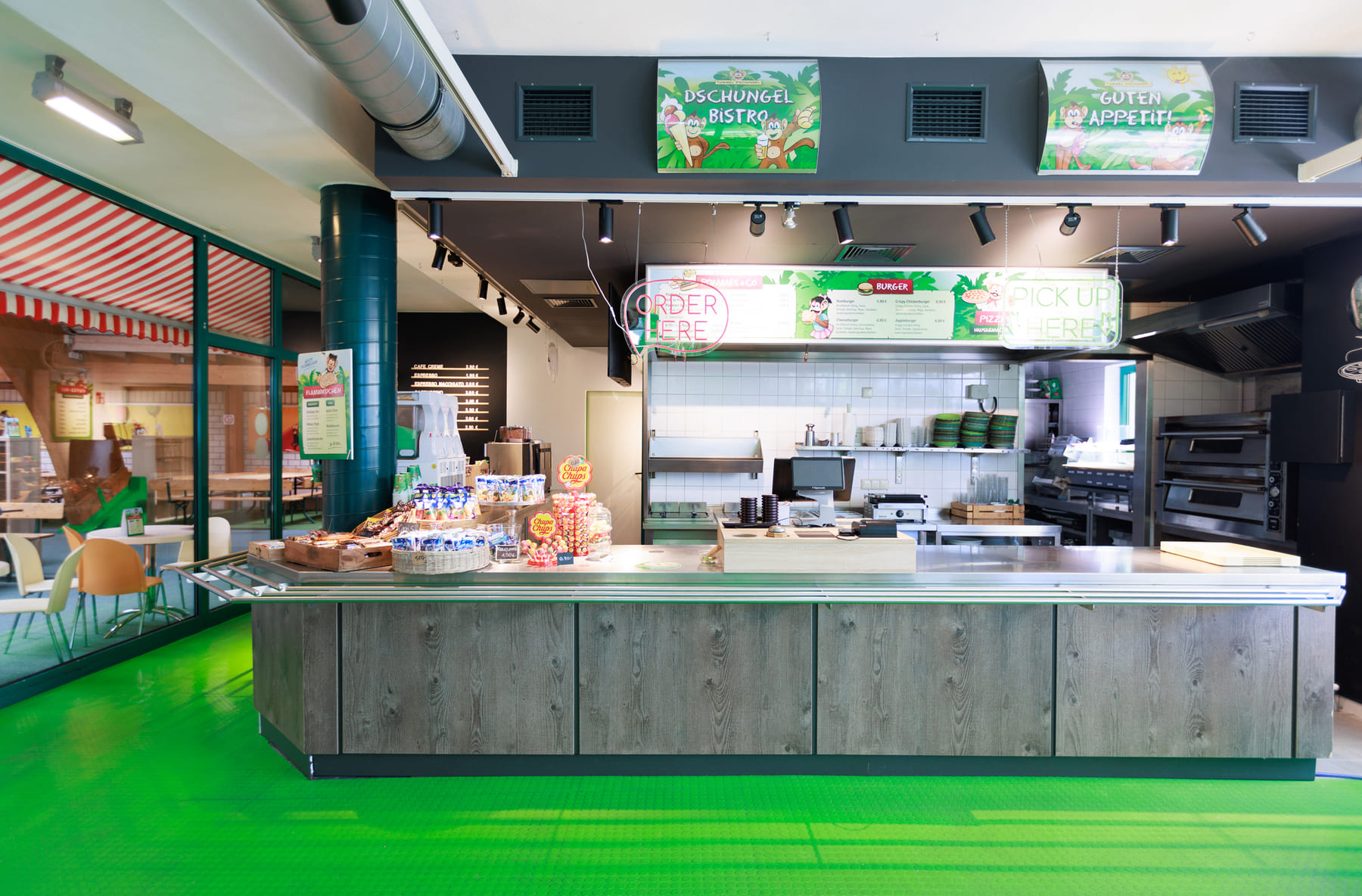 Mit Hilfe eines Gastronomie-Beraters wurden die funktionellen Abläufe und das Angebot des vorhandenen Restaurants neu konzipiert. Jedoch sollten wesentliche Bestandteile wie die Kinderspielecke, der Boden etc. nur integriert aber sonst unverändert bleiben. Eine klar strukturierte Fläche ermöglicht nun mehr Orientierung, kürzere Wege und stimmige Abläufe für die Mitarbeiter*Innen und für die Kunden der verschiedenen Altersstufen reibungslose Einkaufserlebnisse. Das farbliche Konzept aus schwarze, Eichenholz und Bepflanzung ergänzt die vorhandenen Materialien und das Dschungelkonzept des Indoor-Spielplatzes.