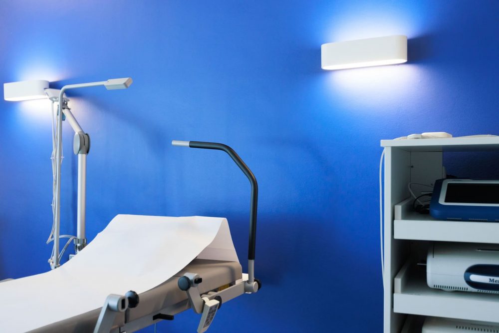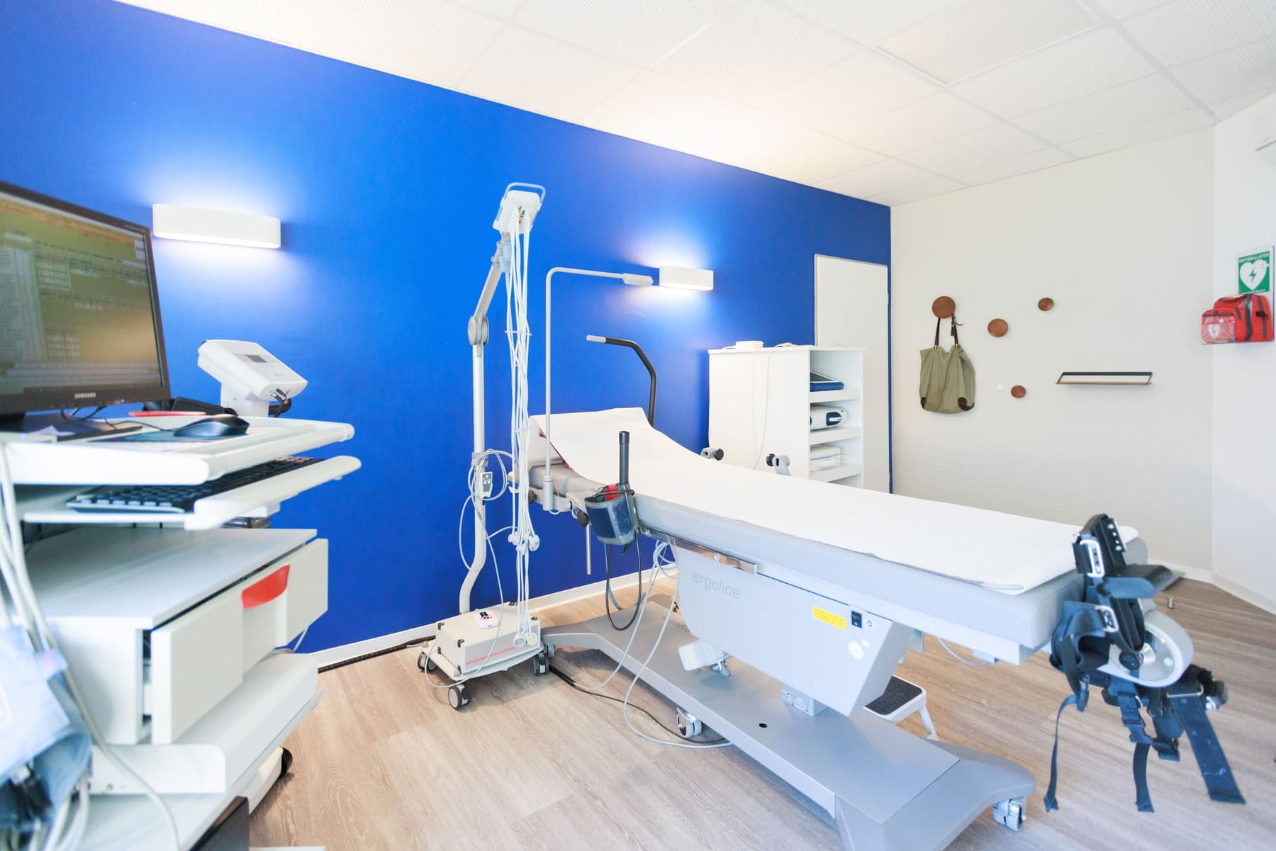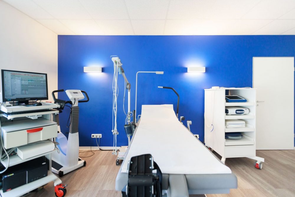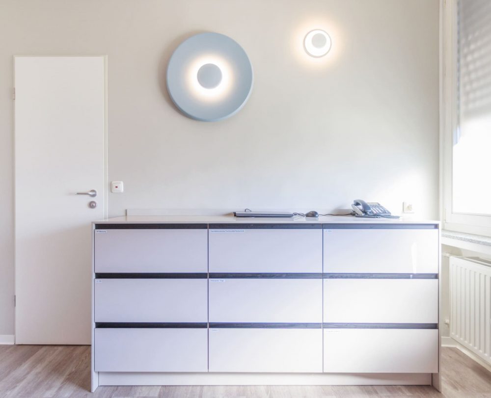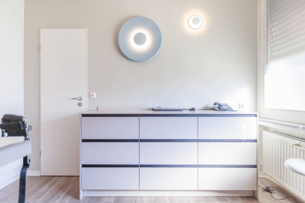 Für eine bestehende kardiologische Praxis in Köln wurde ein ganzheitliches neues Konzept geschaffen, welches stufenweise verwirklicht werden soll. Erster Umbauteil war der EKG-Raum sowie ein Besprechungszimmer. Intensives Blau in Kombination mit Beige und Nussbaum stellt die farbliche Gestaltungsgrundlage dar.