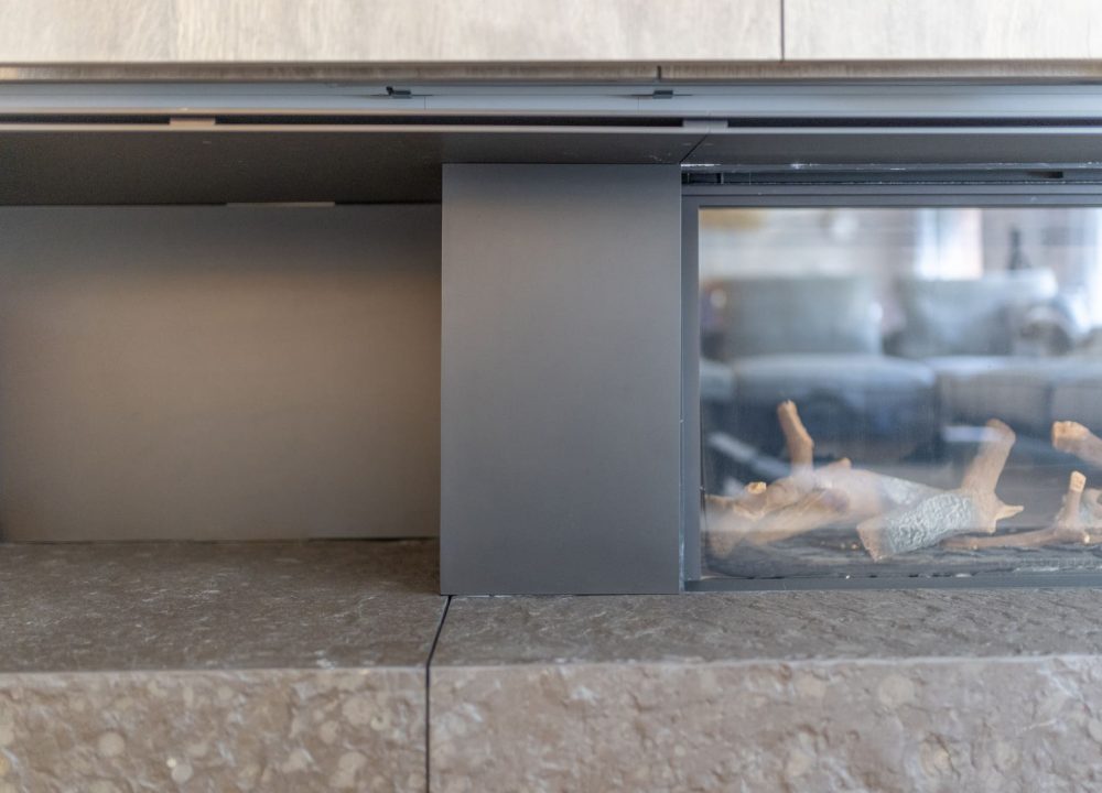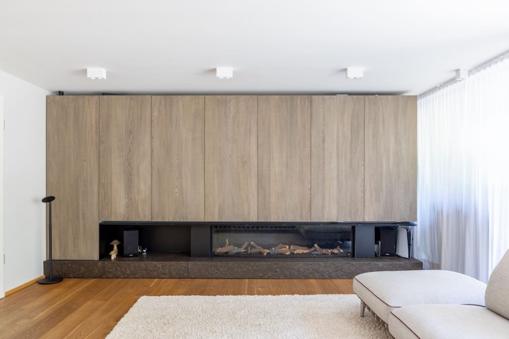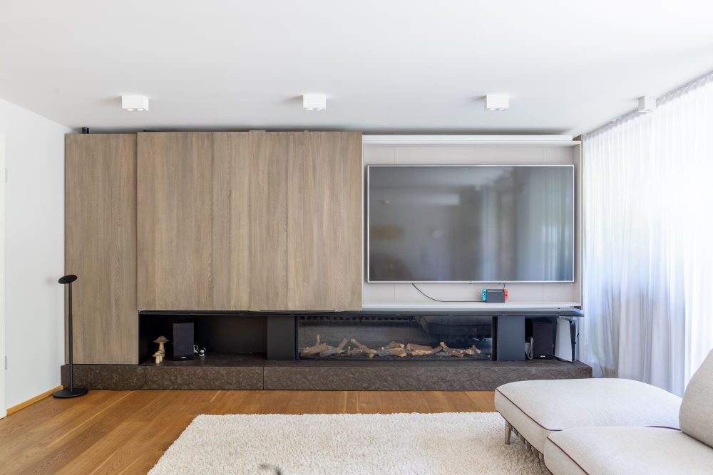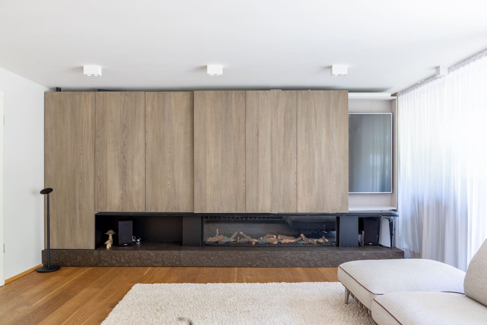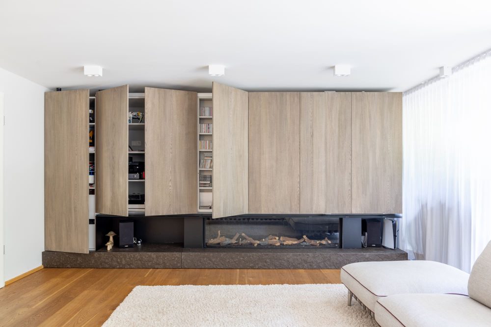 Bei der umfassenden Neugestaltung eines Wohnzimmers in Bergisch Gladbach wurde ein Gaskamin installiert und mit dem Heimkino in eine neue Schrankwand integriert.