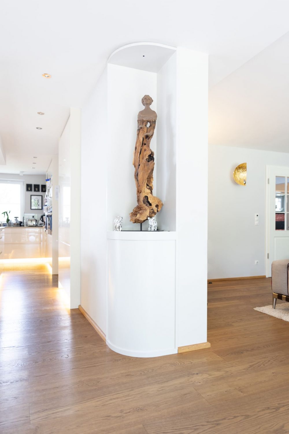 Das abgerundete Kopfwandstück mit integrierter Nische schafft einen Übergang zwischen Eßbereich und Wohnzimmer.